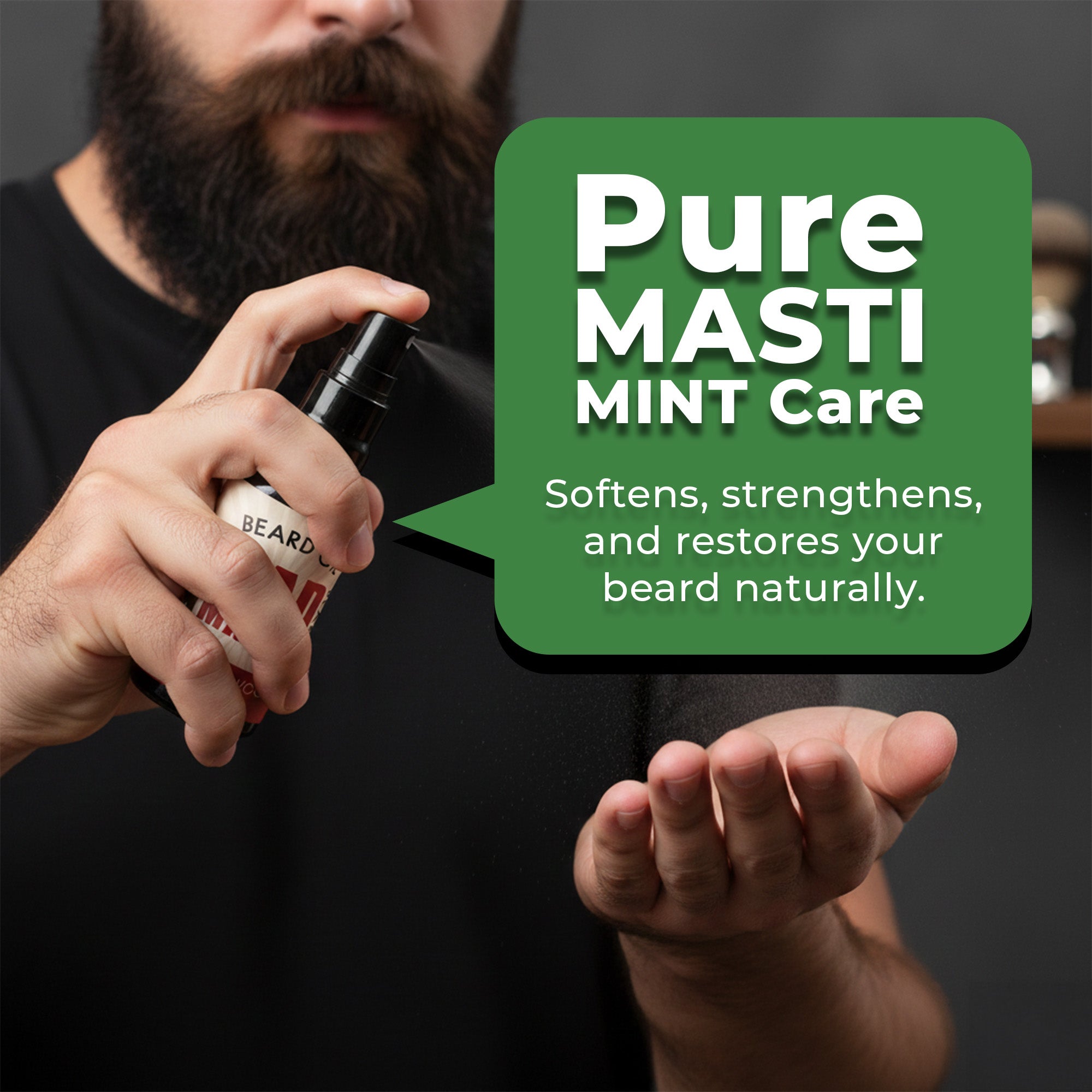 Hold the spray bottle 6-8 inches from your beard (with the cap off). Apply 2-3 sprays evenly across your beard, ensuring light coverage from root to tip.