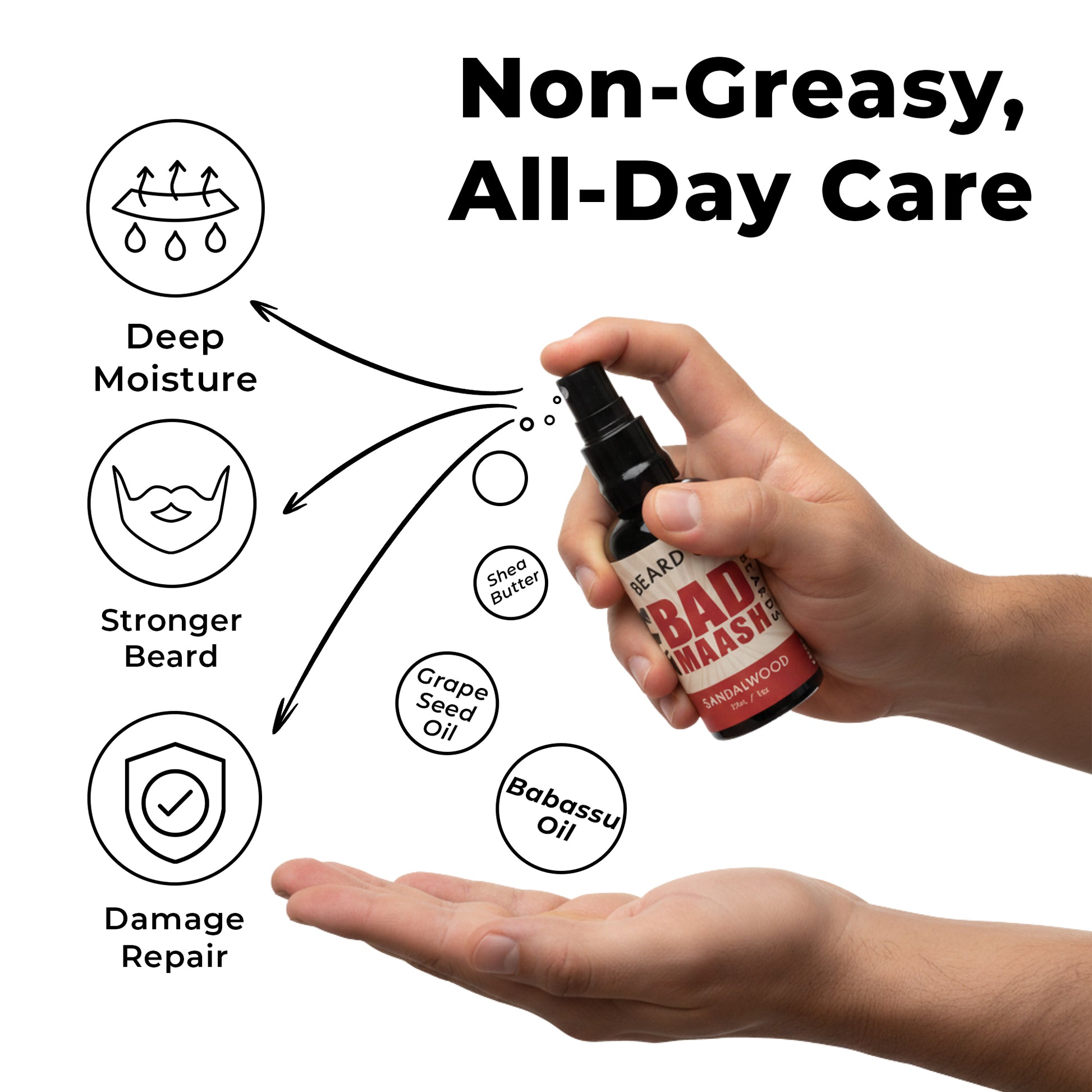 Hold the spray bottle 6-8 inches from your beard (with the cap off). Apply 2-3 sprays evenly across your beard, ensuring light coverage from root to tip.