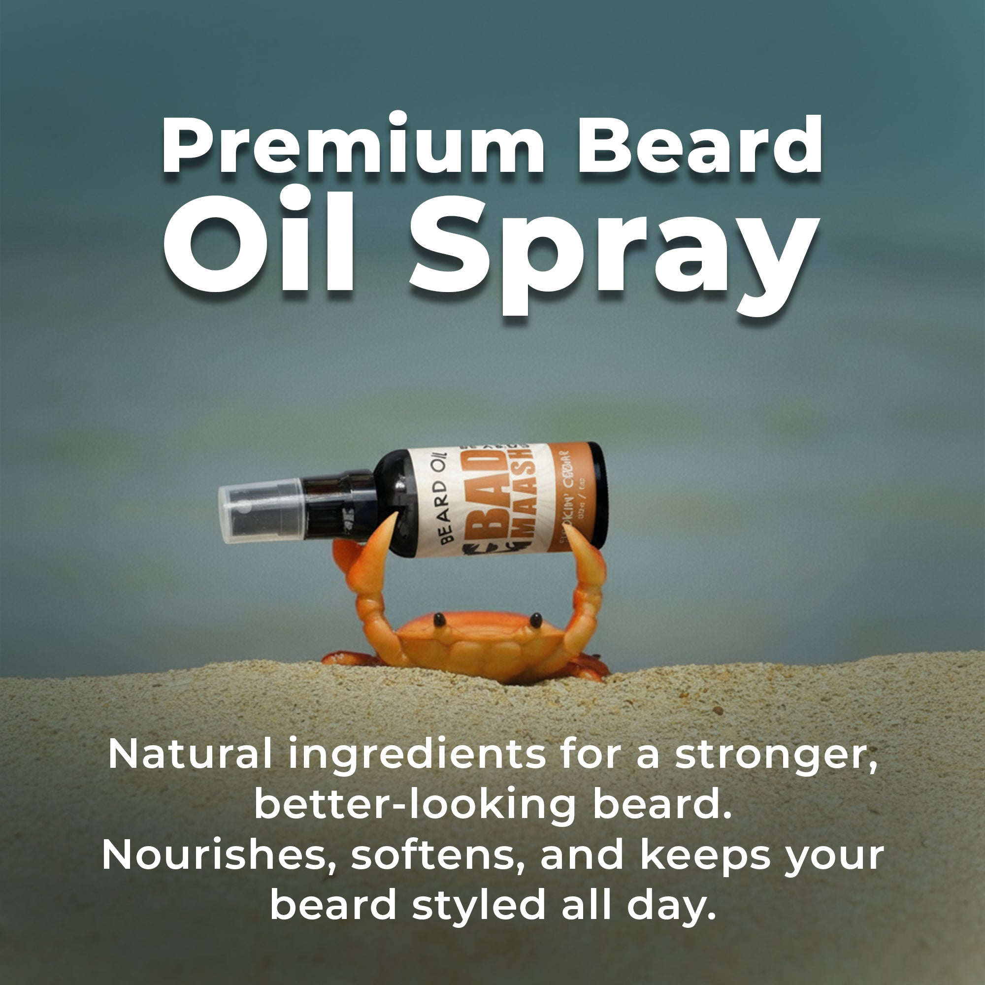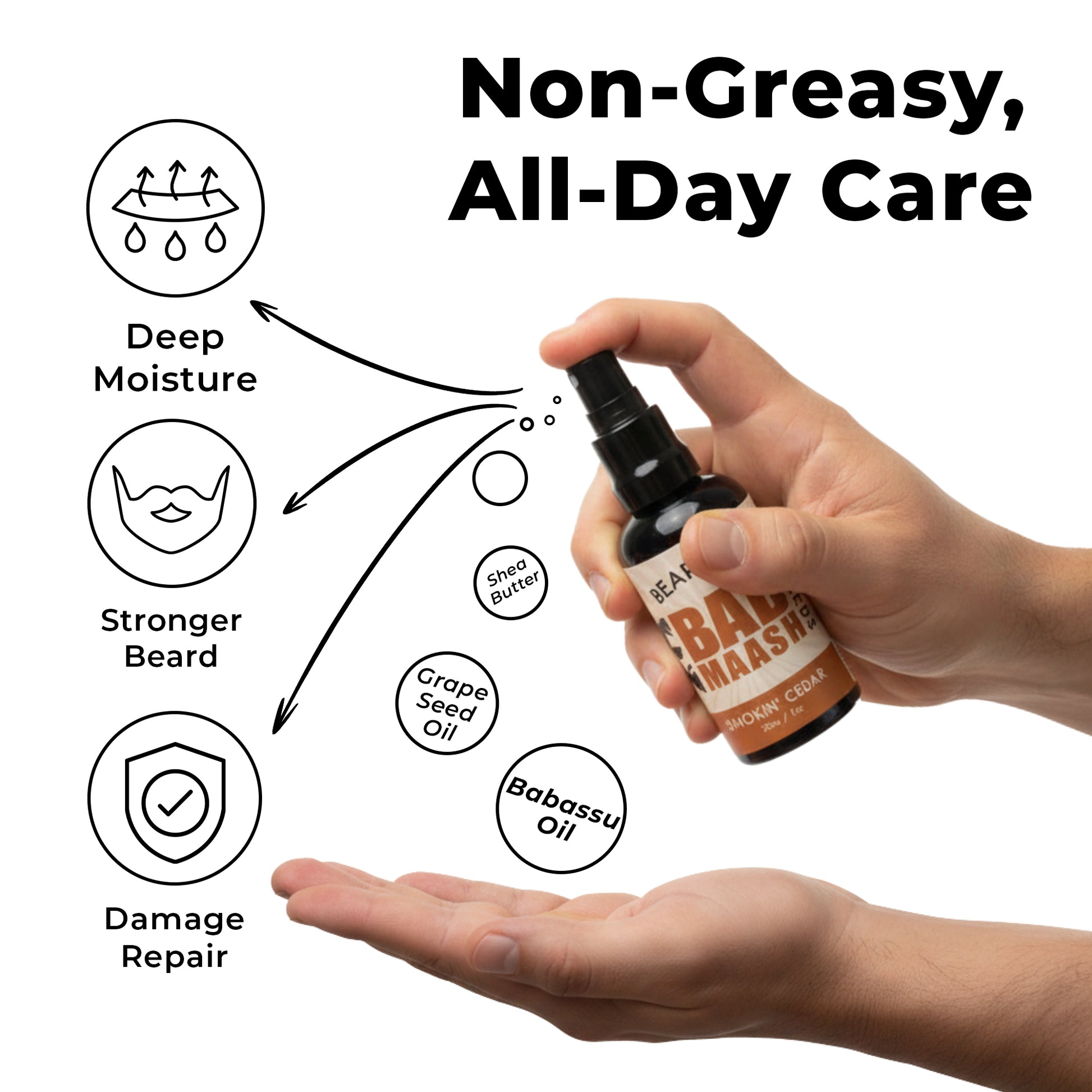 Hold the spray bottle 6-8 inches from your beard (with the cap off). Apply 2-3 sprays evenly across your beard, ensuring light coverage from root to tip.